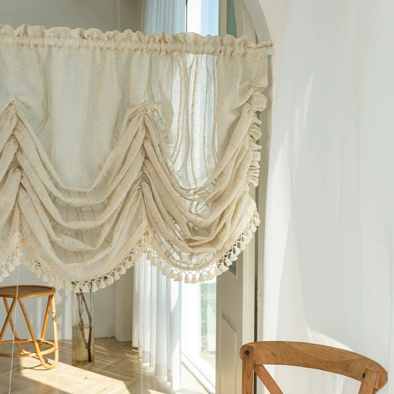 タッセルのアクセントがクラシカルな印象を引き立て、窓辺に上質な装飾効果をプラス。